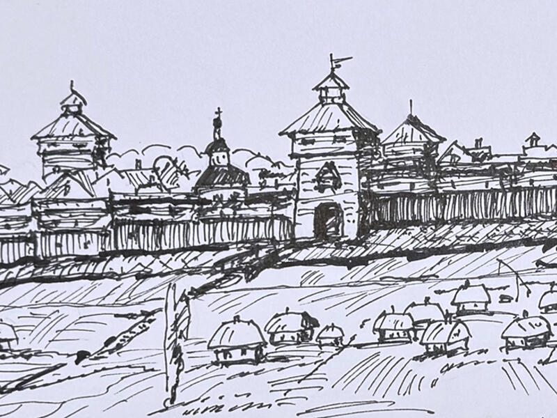 Сидор Колчинцов на мерине с пищалю з рогатиною.